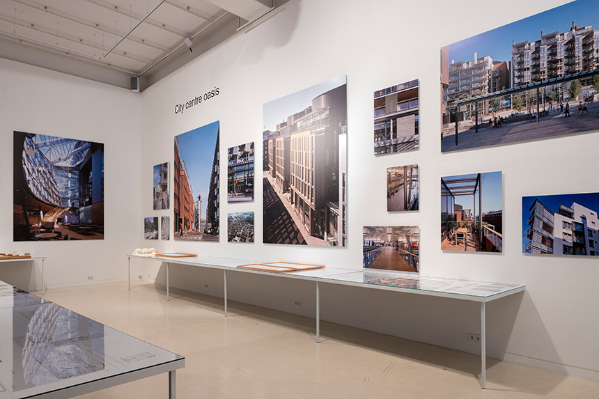 The exhibition itself is spread across both exhibition rooms at Aedes. One room presents the three major key projects in Kamppi, Kalasatama and Sello with the help of numerous photographs, plans and models. The second room showcases other projects of various types, from residential buildings to a metro station, illustrating how Helin & Co has been creating architecture for the people of Helsinki since its foundation. Cinematic drone footage provides insights into how the projects are embedded in their respective environments. A book table invites visitors to delve into the numerous publications about the firm's work while relaxing on chairs designed by founder Pekka Helin.
