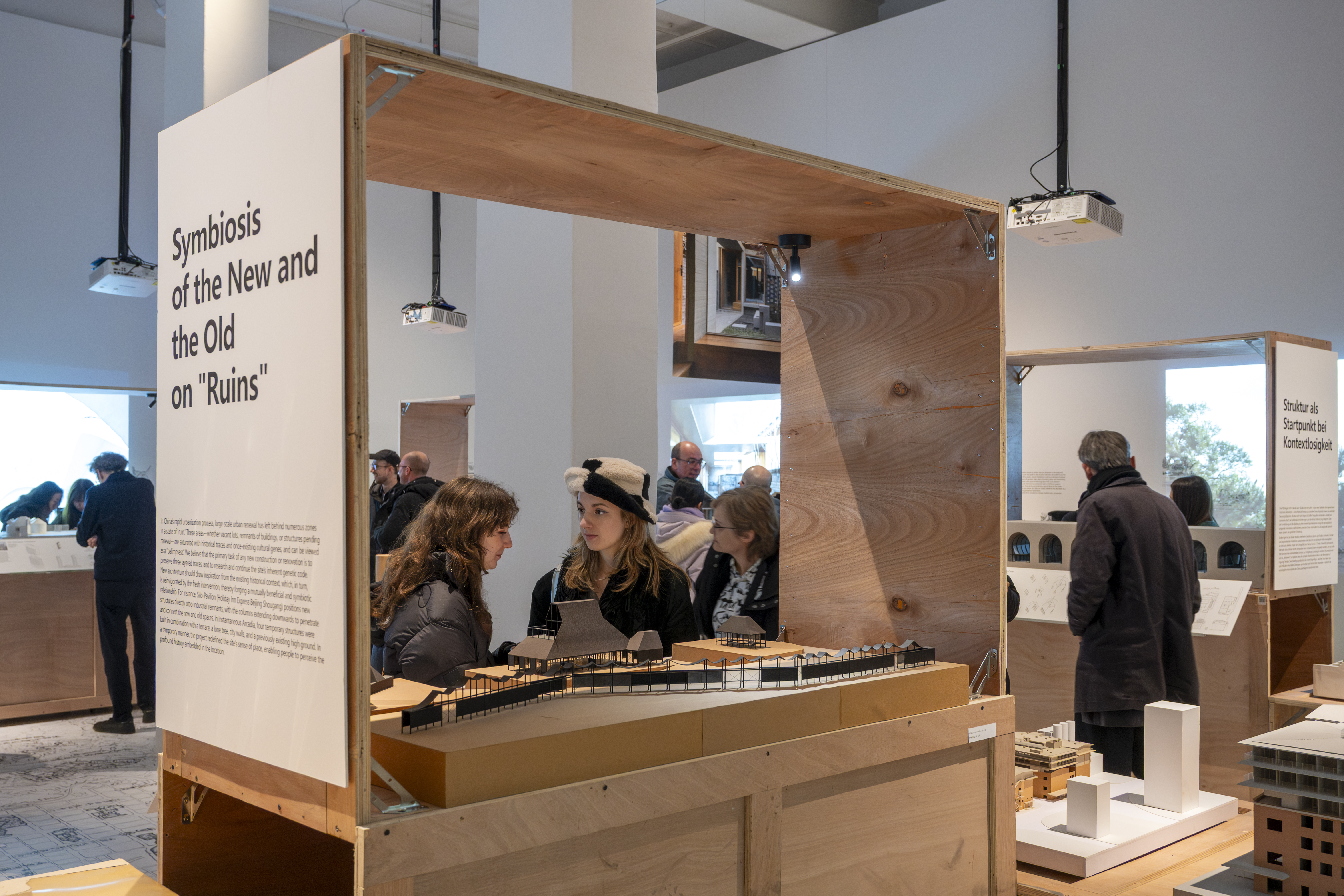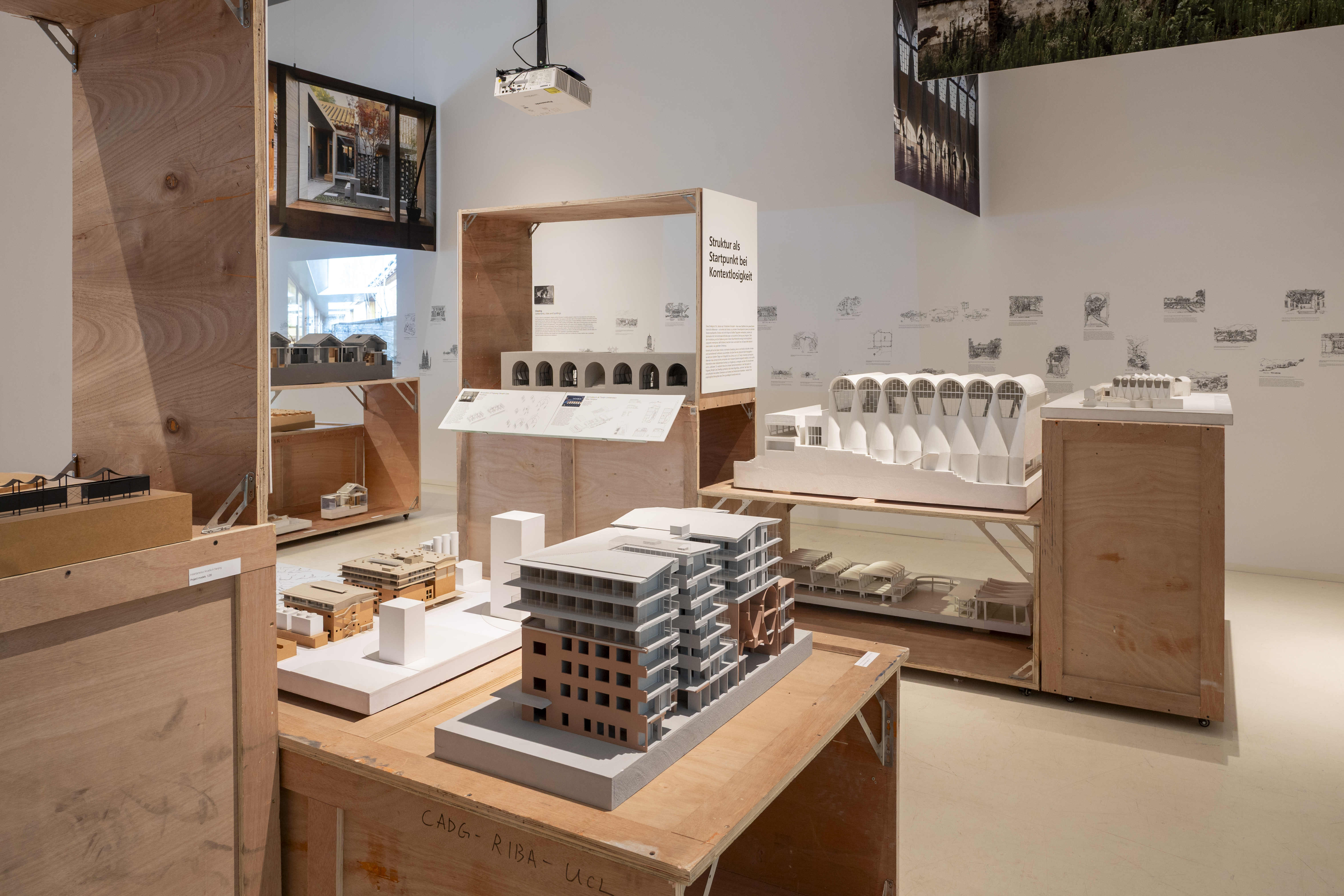 The presentation follows this integrative approach. Sketches, models, photographs, films and spatial installations are arranged in layers, opening up different approaches to the projects. The wooden crates used for displaying models are made from reused transport packaging, referencing the studio's working process in which research, design, construction and use are understood as a connected cycle. At the centre is the idea of a 'Total Milieu' – architecture that is experienced physically and intellectually.