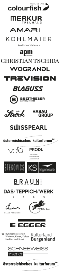 BMWKMS/Sektion IV – Kunst und Kultur, Kulturförderung Burgenland GmbH, Go-International, Amari Austria GmbH, apm Holding, Blaguss Reisen GmbH, Braun Lockenhaus GmbH, Breitwieser Stein GmbH, Colourfish Real Estate, Das Teppichwerk GmbH, Fritz Egger GmbH, H&S Zaun GmbH, HABAU Group, Josef Prödl Tischlerei GmbH, K&S Ingenieure GmbH, Kohlmaier Wien, Merkur Treuhand, Österreichisches Kulturforum Berlin, Schneeweiss interior GmbH, Swisspearl Austria GmbH, Vola Vertriebs GmbH