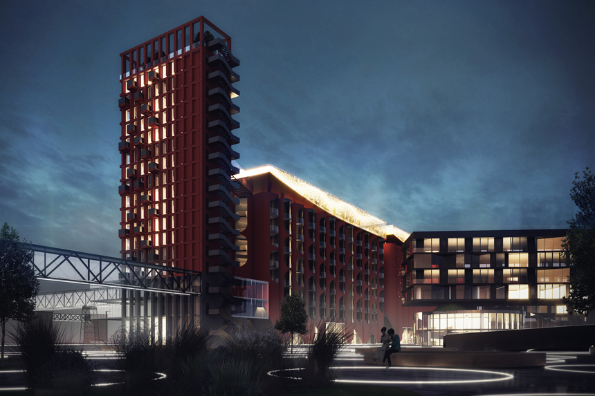 GAFA Architects have interpreted the territory of the port elevator as a platform for an architectural experiment with significance for the entire city. The proposal is based on the idea of dividing the North Spit into a residential district with dense, comfortable development on the one hand and a public and business district with the reconstructed elevator as its principal feature on the other. The site is to be linked to the city by a new tourist route for pedestrians and cyclists. A ring road around the site will make it possible to create several types of public space including a park, an urban balcony-terrace, an open swimming pool, a skatepark, a river quay, an embankment, and a plaza. The sculptural elevator building will be divided into four blocks with different functions — a boutique hotel, an art space, a concert hall, and an office tower. Full or partial preservation of the silos is for this project a key instrument in transforming the site. The towers will contain hotel rooms, light installations, and a transformable concert hall with a window overlooking the park. The working tower will house offices, co-working spaces, and lecture halls, while the old three-storey warehouse building is to be turned into a venue for public events with exhibition spaces, a museum, and a market with cafés. The façade of the warehouse building is to be made of tent-like material; this will make it possible to change the building’s appearance to suit events being held inside it and likewise to turn its external walls into a gigantic cinema screen. Between the elevator and the tip of the spit there will be a circular building containing apartments with panoramic views of the river and the internal park. Apartment blocks with pitched roofs will stand at the boundary between the residential and public/business districts, harmoniously uniting them.