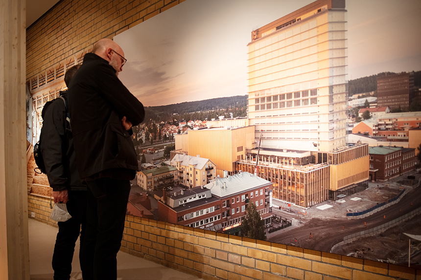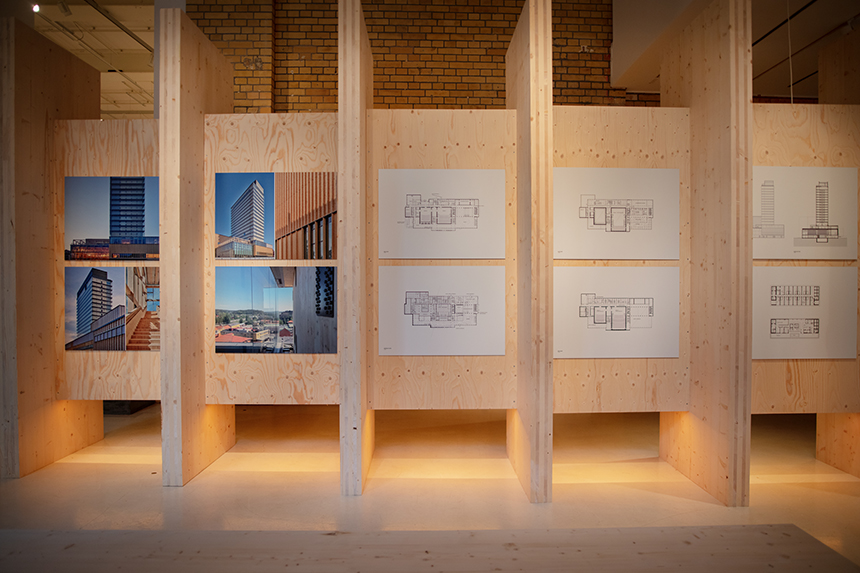 Die Ausstellung Ein Herz aus Holz gibt Einblicke in den innovativen Bauprozess, stellt aber auch die vielfältigen sozialen und kulturellen Nutzungsmöglichkeiten dieses Holzbaugiganten vor. Anhand von Zeichnungen, Modellen, Fotos und Filmen werden die Themen auf großformatigen Holzwänden präsentiert. Die Ausstellung und die von White Arkitekter gestaltete Installation vor dem Aedes Architekturforum bilden einen Ort der Begegnung.