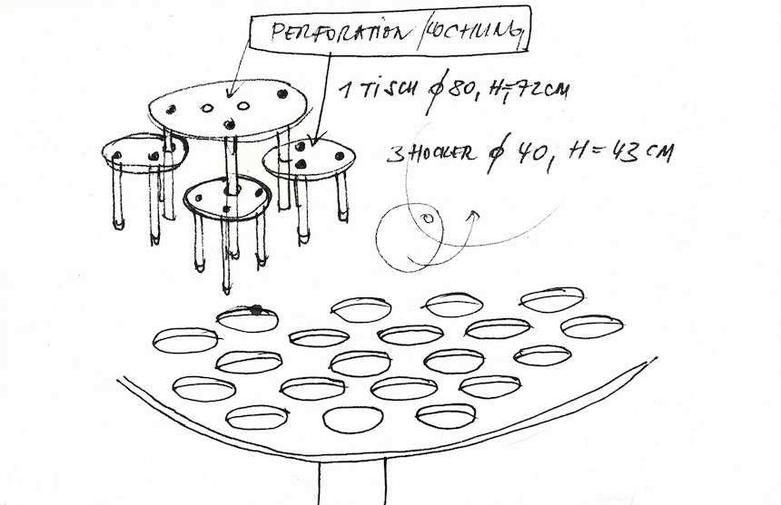 • A Bunch of Holes, a table and three stools, AT, 2022