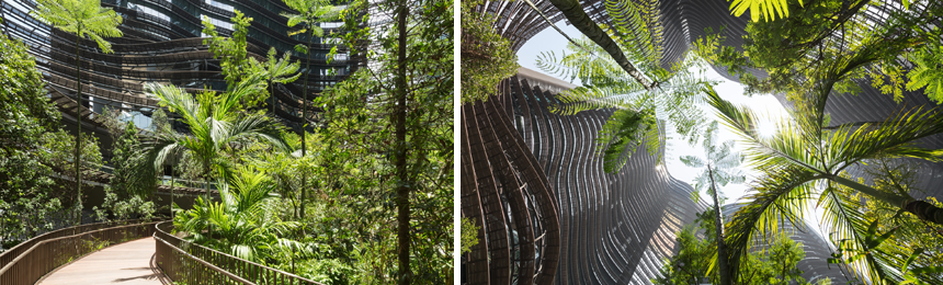The organic shape of the building complex with its iconic louvres, and the generous planting, contribute to an improvement of the microclimate and increase biodiversity. Inspired by Asian paddy field terraces, the green center formed by the four towers—with its multi-story three-dimensional gardens—reflects the diversity of tropical flora and creates a new habitat. This "Green Heart" comprises over 350 different types of trees and plants, including 700 trees, on a landscaped area of 37,000 square meters. Various types of animal become part of this biological diversity.