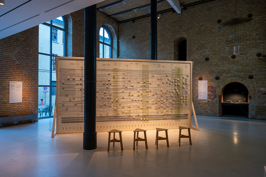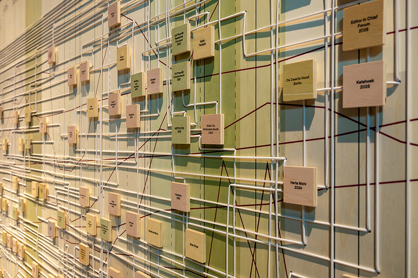 • HOW stellt die Arbeitsmethoden von De Zwarte Hond vor – mit einer Installation aus Filmen und einem Diagramm. Sie macht Inspirationsquellen, Referenzen und Formen der Zusammenarbeit sichtbar. Die Filme thematisieren Handwerkskunst, Gemeinschaft und den Wert offener Räume, während das netzwerkartige Diagramm die Einflüsse abbildet, die die Arbeit prägen. So entsteht eine „Wolke“ von Ideen, die zeigt, wie das Studio Wissen teilt, weitergibt und kritisch reflektiert.