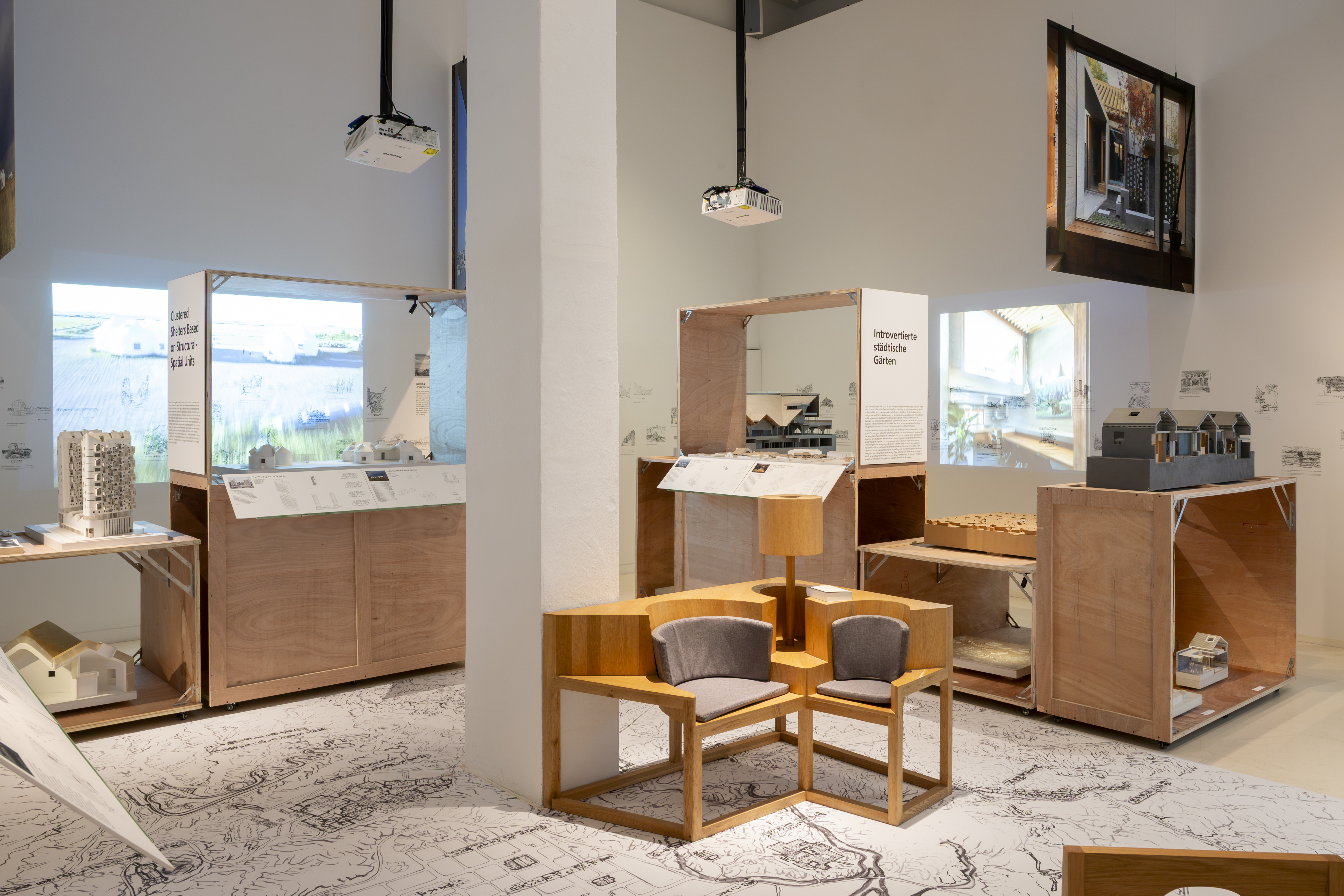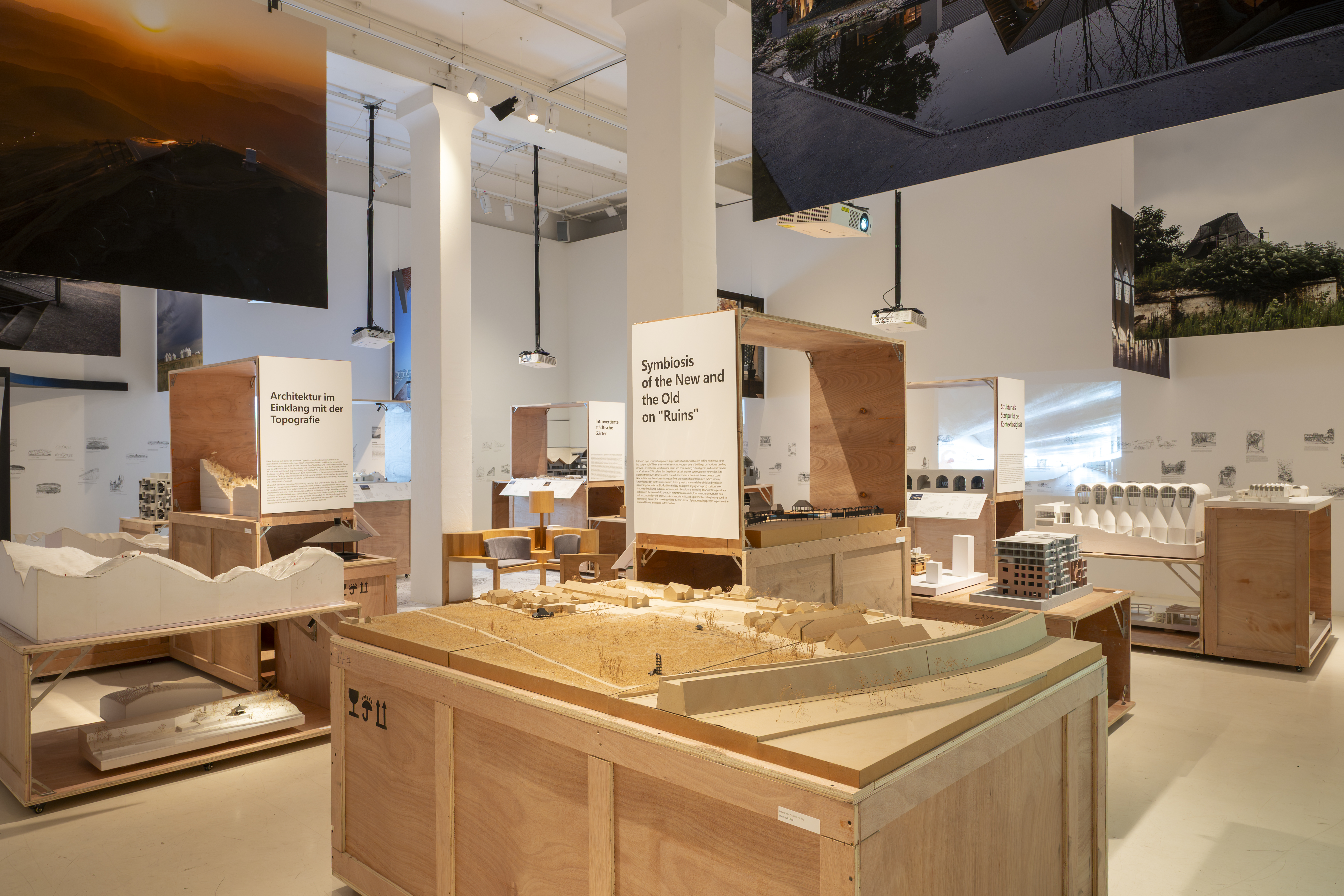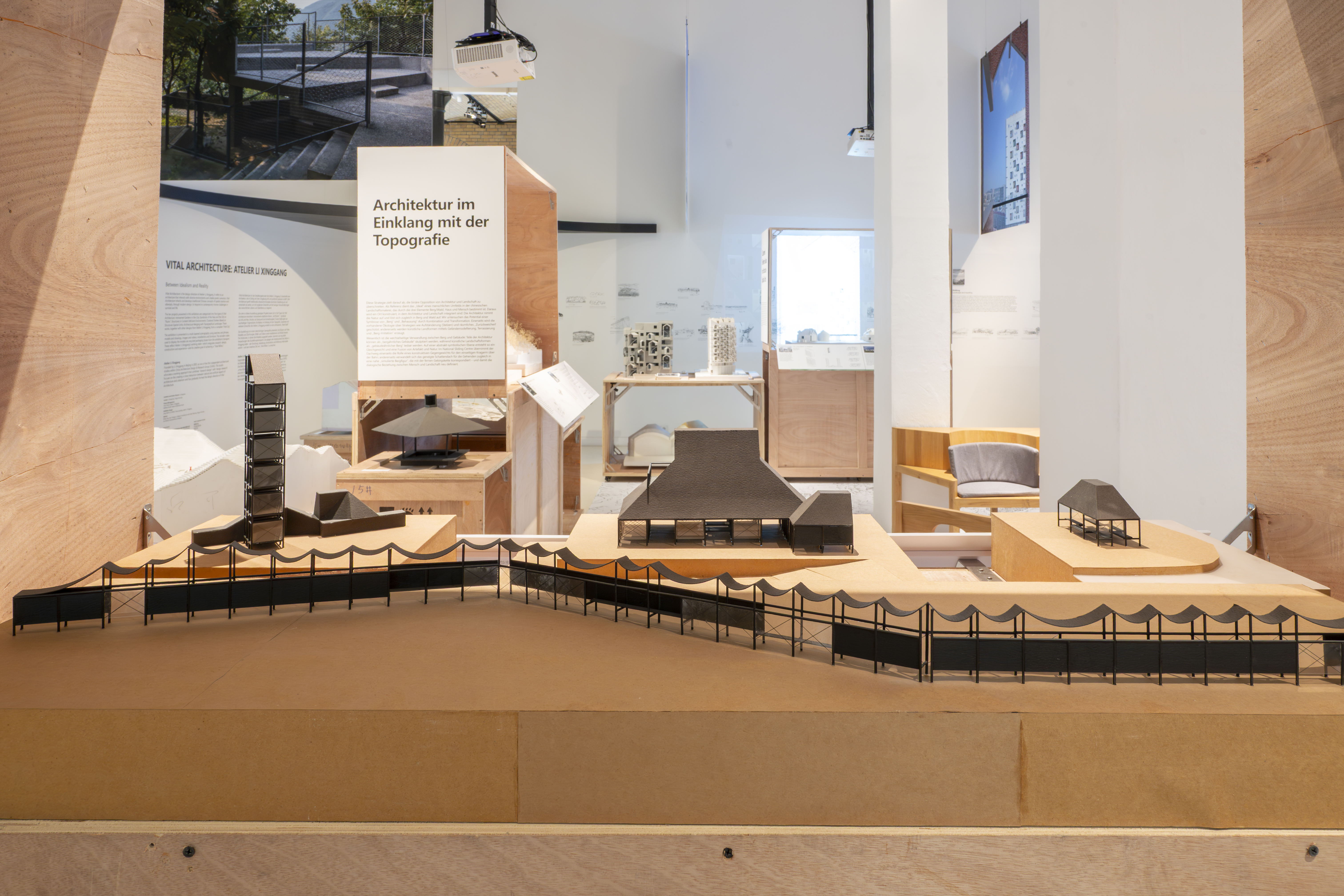 The presentation follows this integrative approach. Sketches, models, photographs, films and spatial installations are arranged in layers, opening up different approaches to the projects. The wooden crates used for displaying models are made from reused transport packaging, referencing the studio's working process in which research, design, construction and use are understood as a connected cycle. At the centre is the idea of a 'Total Milieu' – architecture that is experienced physically and intellectually.