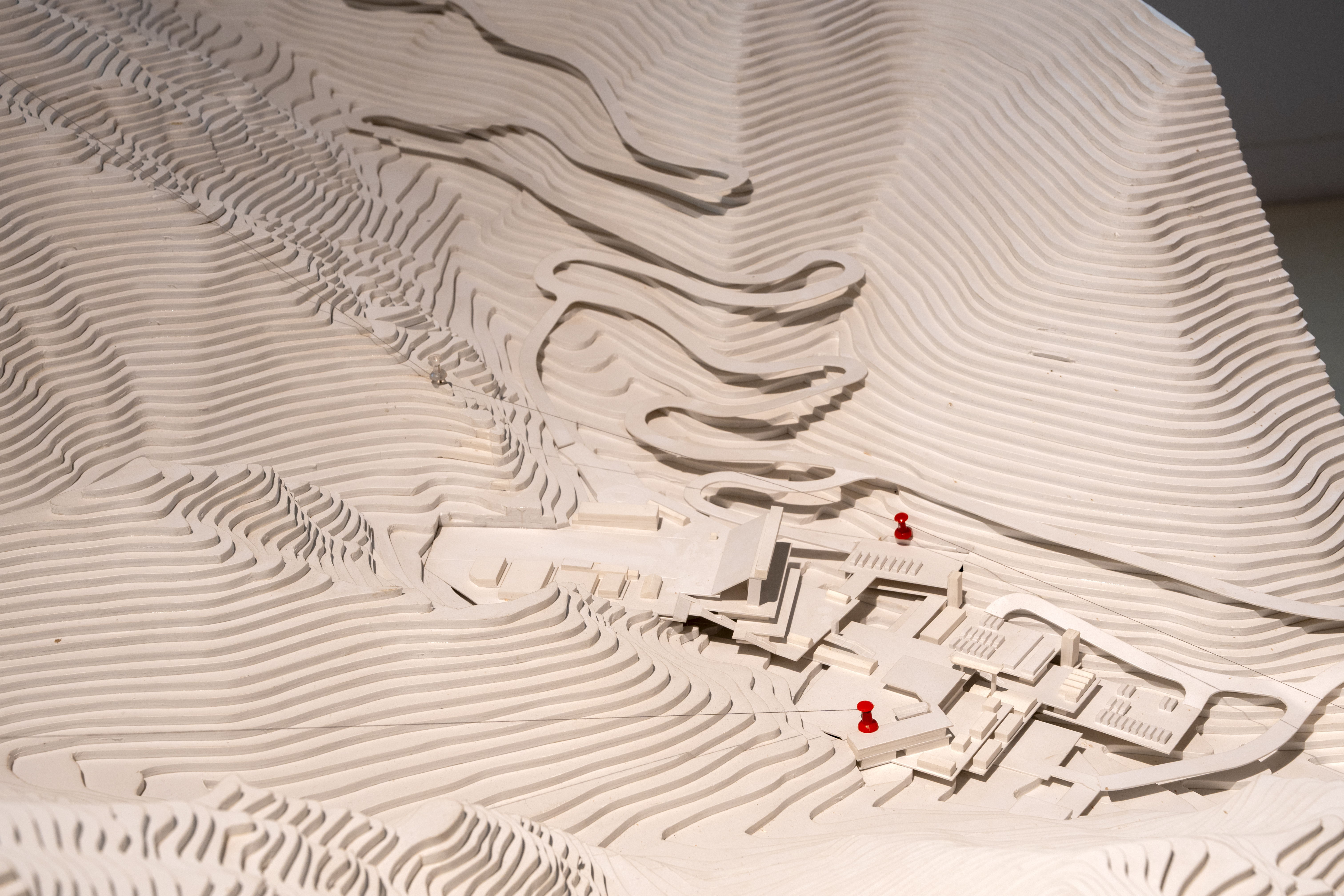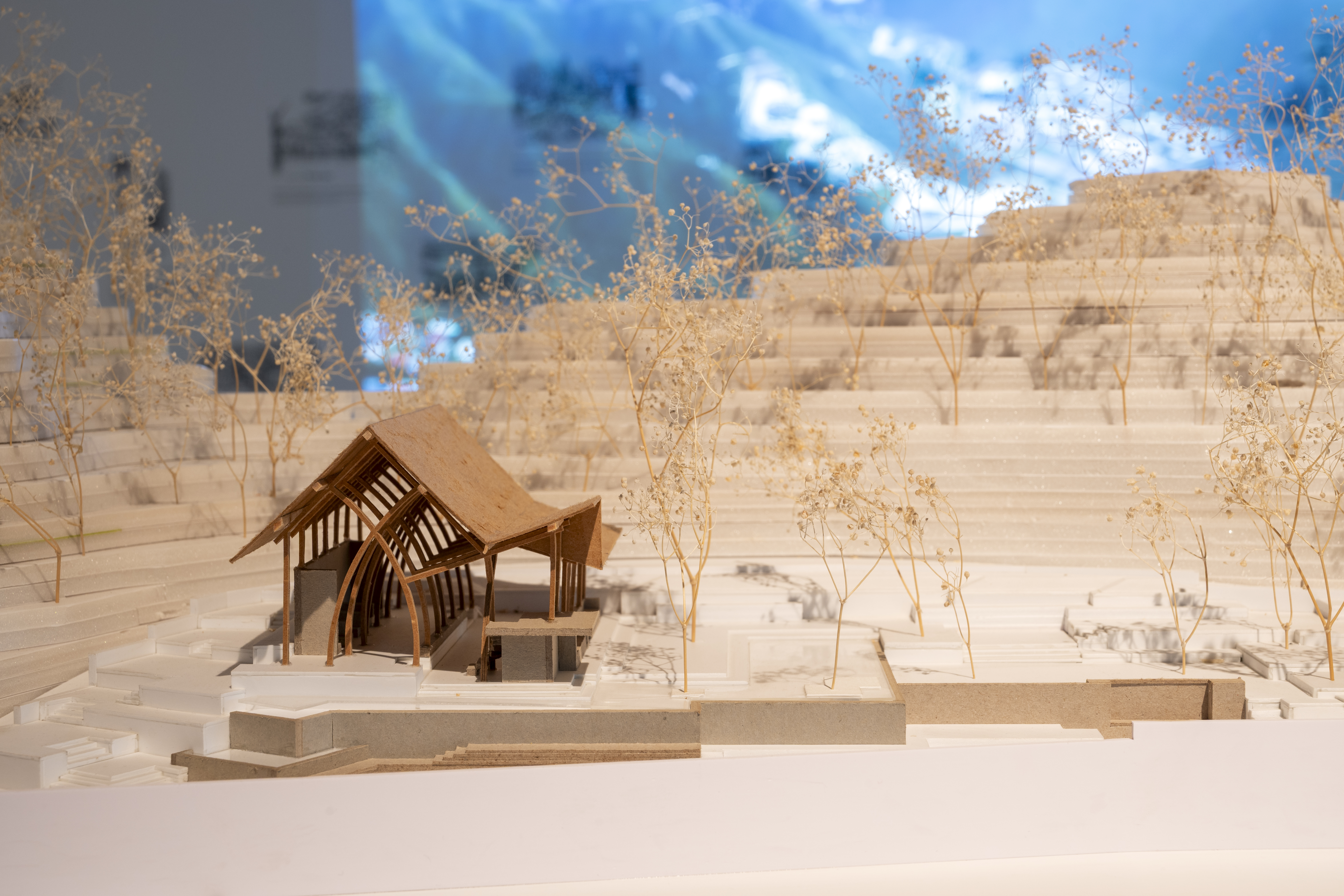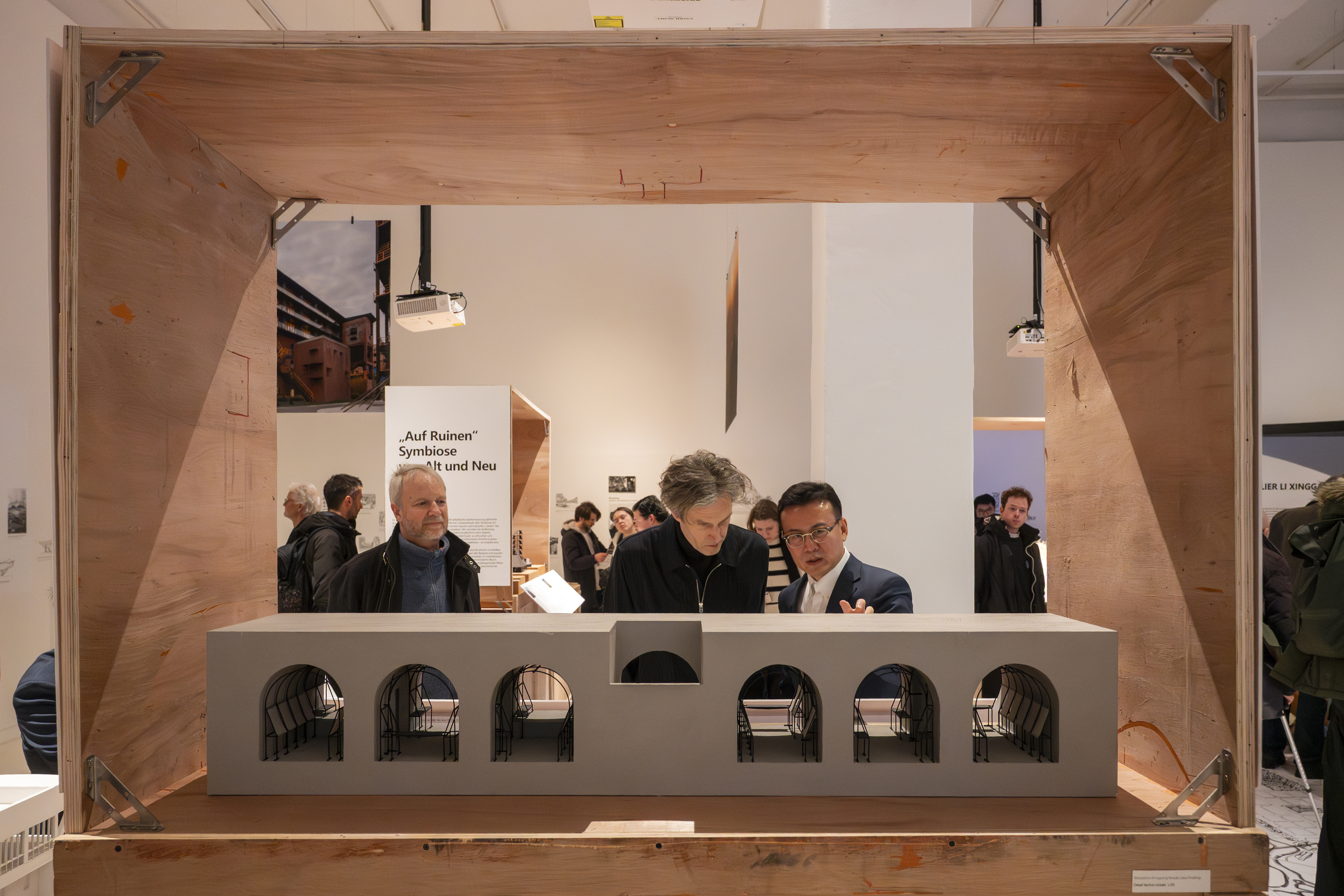 The presentation follows this integrative approach. Sketches, models, photographs, films and spatial installations are arranged in layers, opening up different approaches to the projects. The wooden crates used for displaying models are made from reused transport packaging, referencing the studio's working process in which research, design, construction and use are understood as a connected cycle. At the centre is the idea of a 'Total Milieu' – architecture that is experienced physically and intellectually.
